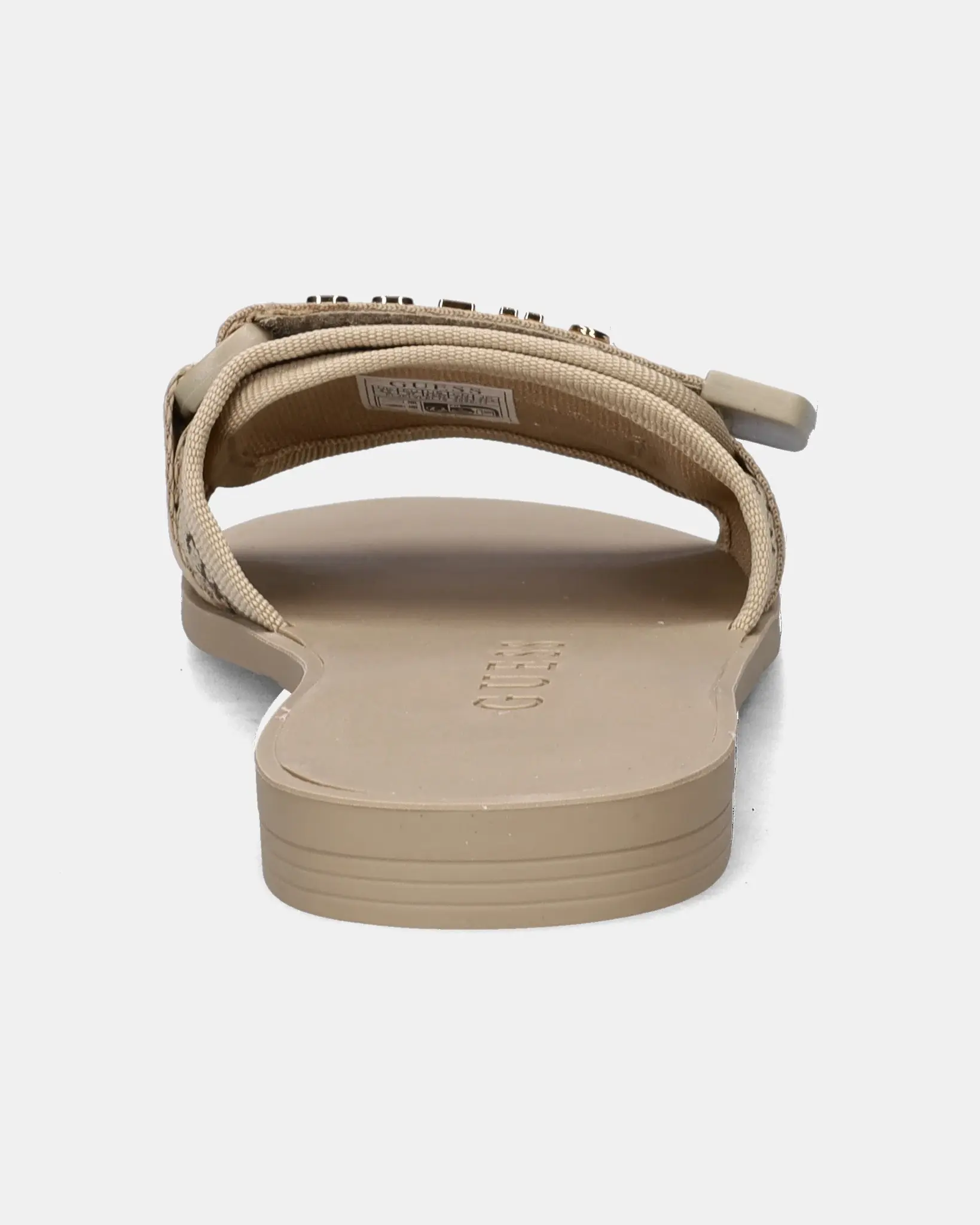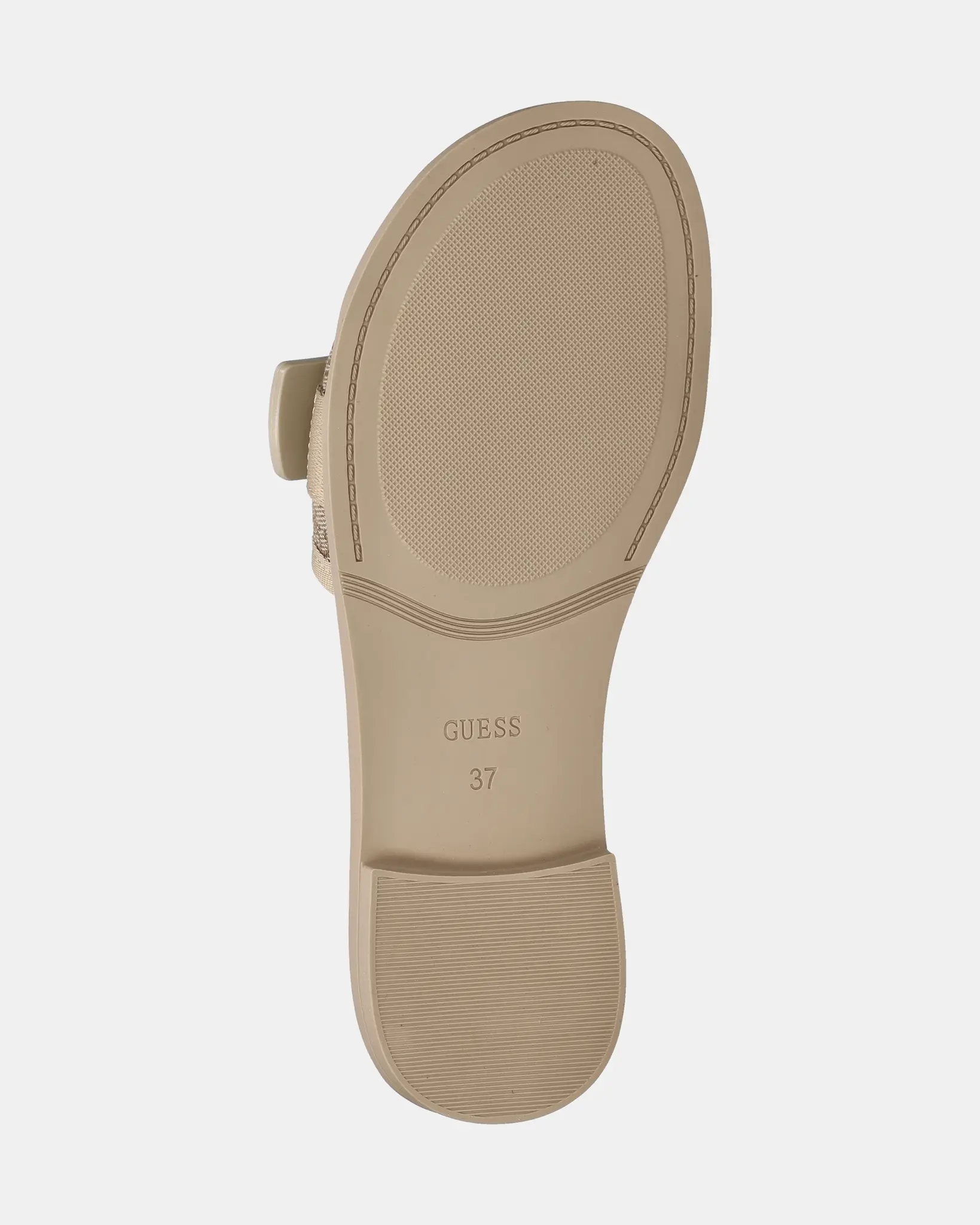 Platte sandaal van GUESS® in beige monogramstof met zilvermetallic gesp en nude zool. Een zomers en verfijnd model dat de iconische print van het merk combineert met metallic details voor een stijlvolle strand- en urban look. Brede band in monogramstof van Guess in beige en bruine tinten als belangrijkste en iconische element. Zilvermetallic gesp met merklogo als opvallend detail Slip-on ontwerp voor snel en comfortabel dragen Nude-kleurige platte zool voor een harmonieuze en flatterende afwerking Guess logo gegraveerd op de binnenzool voor subtiele, kwalitatieve details Veelzijdig ontwerp geschikt voor strand- en urban looks in de warmere maanden.